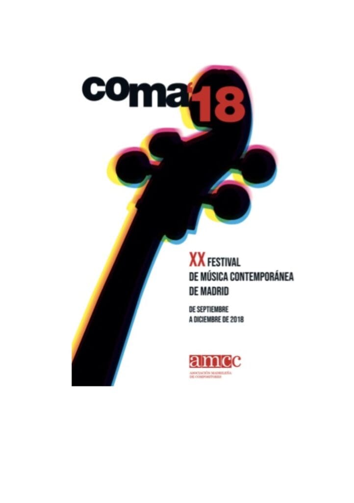Programa de mano completo del concierto-homenaje a Miguel Bustamante organizado por la Asociación Madrileña de Compositores. Festival de Música Contemporánea de Madrid, COMA’18. Sala Manuel de Falla de la SGAE. 13 de noviembre de 2018