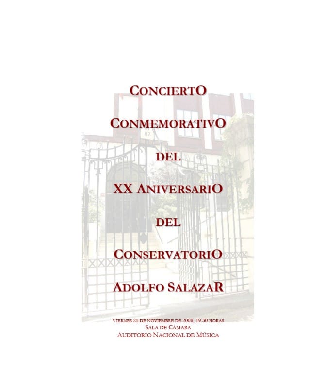Programa de mano completo del estreno de ‘Ferraz 2008’ de Miguel Bustamante. Concierto Conmemorativo del XX Aniversario del Conservarorio ‘Adolfo Salazar’ de Madrid. Auditorio Nacional de Música, 21 de noviempre de 2008.