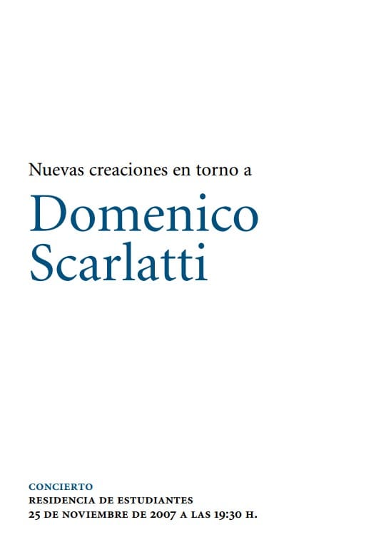 Programa de mano completo del estreno del ‘Cuarteto Scarlattiano’ de Miguel Bustamante. Nuevas creaciones en torno a Domenico Scarlatti. Residencia de estudiantes, 25 de noviembre de 2007