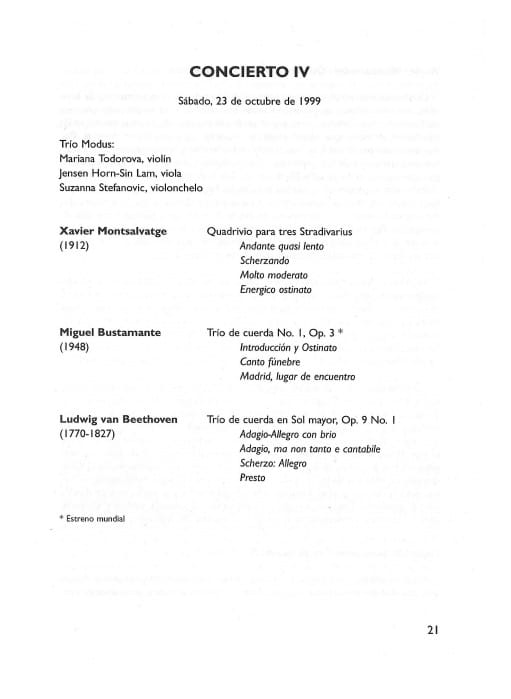 Programa de mano del estreno del ‘Trío de cuerda’ de Miguel Bustamante, por el Trío Modus. Ciclo de Música de Cámara de la OSCRTVE organizado por Radio Clásica. Real Academia de Bellas Artes de San Fernando de Madrid, 23 de octubre de 1999.